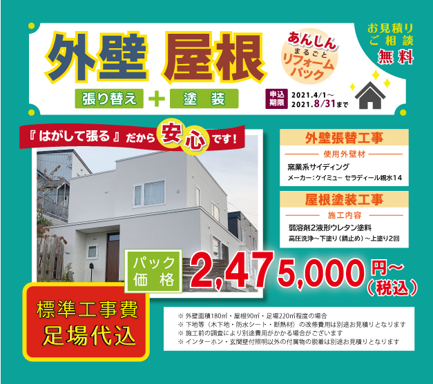 標準工事費・処分費用・足場代込みのパック価格でのご提供は、2021年8月31日までの申し込み期限です!