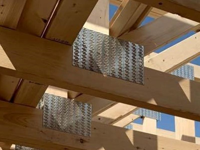 小屋は三角形が連なっているように構成される、トラス構造という加重や耐震性に強い方法で仕上げていきます。裏面に多数の釘状突起があるプレート状金物を木材接合部分に打ち込み緊結していきます。