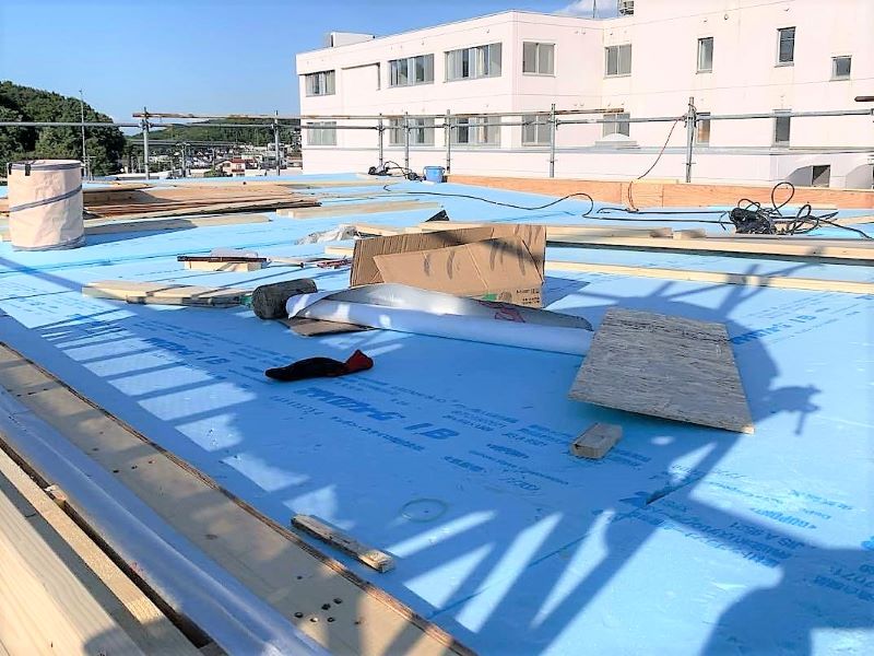 小屋組みが完了し、屋根の下地となる野地板という板を小屋構造の屋根側最上部の垂木に張っていきます。野地板も、耐震性や風雨などへの耐久性が良い構造用合板(野地合板)厚さ12mmのさね付きを使用します。